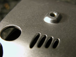 The Innopocket Aluminum Hard Case for Treo 600, $34.99, is a form fitted hard case for the Treo 600. As the name suggests, it is made out of very thin anodized aluminum, adding only about half a centimeter of depth, and half a centimeter of width to the Treo. It weighs about 55 grams. The entire Treo is covered, including the screen and keyboard. There are cutouts for all the details of the Treo: speaker, microphone, hotsync, camera, reset pin, and even the 5-way navigator. On the sides of the case there are little rubber nubs to provide grip when holding the case. Inside, the case is covered in a thin neoprene. Inside the cover, a slide-in SD cardholder is included. Nifty feature. The Treo is held in the case by the friction with the neoprene, and also by a small metal tab that clips into the back of the Treo at the accessory attachment point.