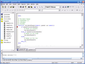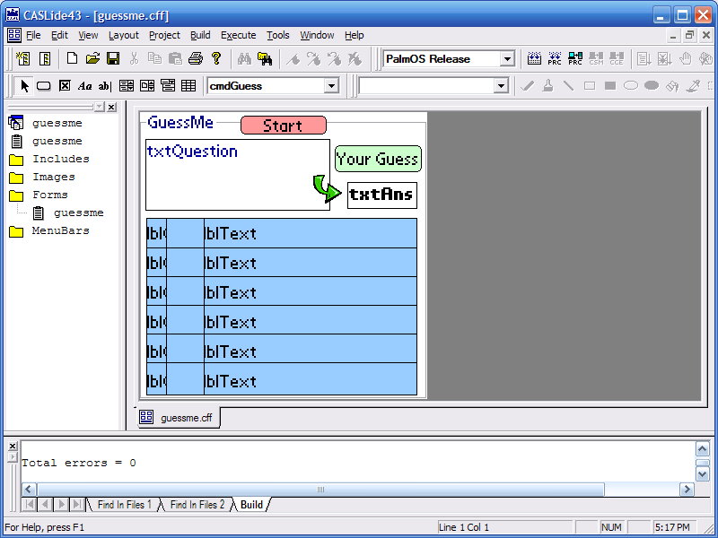 The first step in developing my program was to create a directory called GuessMe, for lack of a better name. Next, I opened the CASL IDE in Windows, selected "New Project" from the menu, entered my project name and began placing controls (or objects) on the CASL form. I was a bit thrown off by the documentation until I realized that a frame and form are the same thing (the documentation used them interchangeably). I wanted to keep my program simple, so there is only one form in my application. I added a label, a button and two text boxes. One text box to enter your number guess; the other to display the response if the guess was higher or lower than the value that the computer picked.