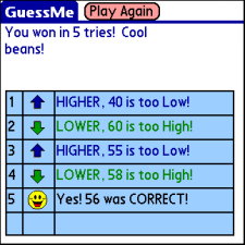 I also added the ability to use the Treo numeric keypad and press enter instead of tapping the button to enter a guess. I found you can create a function by the same name as the text control and then change the values typed. I checked for letters typed and changed them to the Treo numeric equivalent.