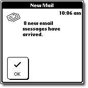 First off, the Treo is the best SMS machine I've ever used. Handspring can send you SMS alerts when you've got new mail--the downside being you only get the alert with the first new email since you last synced your email, there could be 2 or 200 there. When the alert pops up, you can choose to retrieve now or later. If you chose later, a new mail icon appears at the top of the main screen.