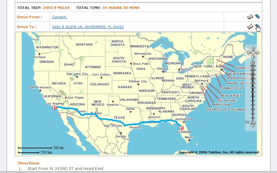In this example, I've entered both my address and TreoCentral's Florida warehouse address and TeleNav's site has plotted and displayed the entire driving route as a blue line with 14 levels of zoom! Although you can't see it in this image, below the map are all the turn-by-turn directions to get from So. Calif. To Florida.