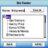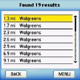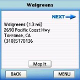 In this series of pictures, I've put on my Joe Tourist hat and want to drive from Harv's house to the nearest Walgreen's drug store. Well there are a ton of them around and Harv's busy building a time machine so I used TeleNav's "Biz Finder" feature and punched in "Walgreen's." Yikes! It found 19 of them on the local map (which is a 15-20 mile radius around your current location)