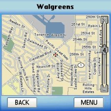 TeleNav goes online, pulls down the map to that Walgreen's and displays it at the default zoom level of 4. We want to zoom in a little more so we move the zoom slider up to level 2. I'd like to see the program remember the last-set zoom level but every time you leave a map and return to it, it defaults back to 4, or halfway.