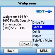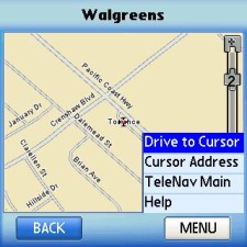 The store is marked by tiny crosshairs in the middle of the screen, so we use the menu and select "Drive to Cursor." We can also save Walgreen's' address for future use with another menu selection so we don't have to go through this routine again it'll just be added to a "most recently used addresses" list that TeleNav stores in your account. From that same menu, we can even dial the store to make sure they have what we want in stock.