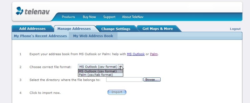 You can also use TeleNav's extensive Web site features to enter addresses, plot routes, even import your Treo's contacts, build an online address book unique to your account, tap an icon, and have that person or business' address sent to your phone for navigation. In other words, the PalmOS (handheld) TeleNav can function standalone, or work in tandem with the Web site.