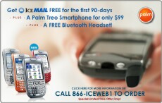 IceWEB, Inc., a leading provider of subscription based Hosted Microsoft Exchange services, enterprise software and network security infrastructure services, just announced a limited time special offering of its IceMAIL Hosted Exchange service bundled with the Treo 680 or Treo 700wx smartphone. Available through IceWEB and Simply Wireless Inc., the $99.00 offer includes a deeply discounted Treo 680 or Treo 700wx ($299.00) smartphone, the “IceMAIL Small Office Bundle” (5 hosted Microsoft Exchange Email accounts, fully functional copies of Microsoft Outlook 2007, online virus scanning and spam filtering, and live synchronization of all Outlook data to the Treo smartphones, at NO CHARGE for 90 days), a free Palm Bluetooth wireless headset, and services from Simply Wireless and Cingular or Sprint. The offer will be available through January 31st, 2007. For more information, go to IceMAIL’s website www.iceWEB.com, or call 1-888-ICEWEB1.