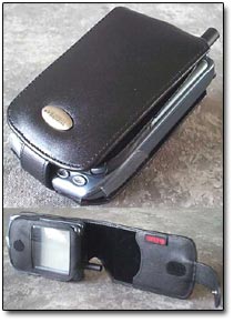 The outer cover protects the whole front of the Treo and is the continuation of the same piece of leather that makes up the back of the case. It has a tab at the end which wraps around the bottom of the case and snaps into one of two snap sockets on the bottom of the back of the case. There's a tasteful silver plate on the front with the Krusell name and logo on it, and a cutout at the top of the case where the antenna fits.