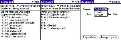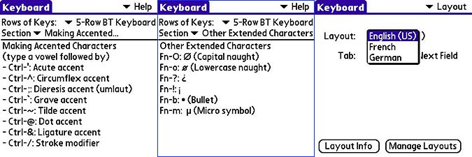 To type accented characters, which the Palm OS Treos thumbable keyboards support elegantly, you have to resort to a complicated Fn-key plus vowel keypress, and other shenanigans. But it works. English doesnt often need accents, anyway, but typing in French or Spanish will prove challenging. The keyboards documentation is printed in French and German, but not Spanish, and you can set it up as a French keyboard, although the keycaps dont provide much of a clue as to what keypress produces what character. The resulting French keyboard is QWERTY, not AZERTY. I didnt try the German keyboard option, since I learned everything I know about that language from reading Mark Twain. The company apparently plans additional remapping options, as theres a menu for installing other keyboard maps.