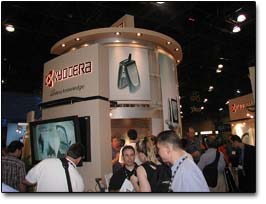 Kyocera is getting a lot of attention at the show for their 7135 CDMA smartphone. This unit has a clam shape design with a 16-bit color screen on one side, and the graffiti area, buttons, and a numeric phone pad on the other side.