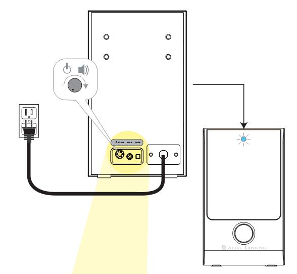Thankfully, that smoothly-damped knob has a center detent so it's easy to give it a twist to power up the subwoofer. A pleasant and not screamingly-bright blue LED, invisible when it's off, lights up behind the top of its front grille so you know it's on. Then turn the knob a tad and without looking at it, thanks to that detent, you can feel when it's set to "half way."