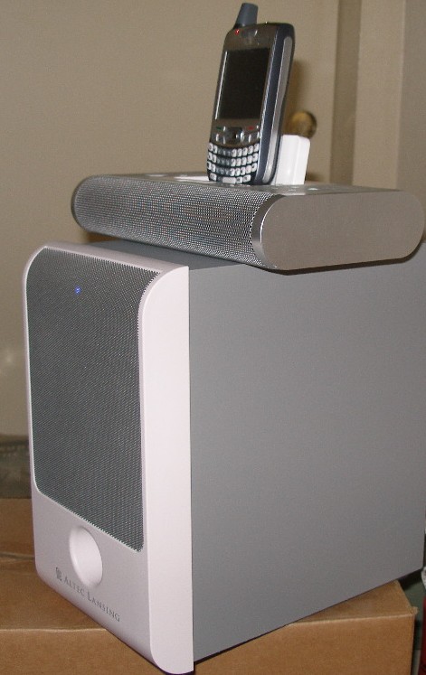 The Altec Lansing BB2001 is an optional accessory subwoofer for their multi-purpose iMT1 Treo speaker system / speaker phone / charging and sync station and for some other Altec portable speaker systems with a "sub-out" port. Jay did a fine and detailed job of reviewing the IMT1 last year, so rather than repeat what he wrote, I'd suggest you read his excellent review then c'mon back here. I'll wait..