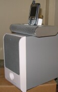 Now the fun begins. Plop your Treo onto the iMT1's standard Palm connector, power it on and start some music playing. Pick something from your library with wide dynamic range, whatever your preference in music, be it pop, rock, classical, jazz, blues, soundtrack music.. any well-recorded audio with decent dynamics. Doesn't sound too bad coming out of the iMT1 alone, although there's not a whole lot of stereo separation from those tiny speakers behind a grille that's not even a foot wide, but still, it's acceptable.