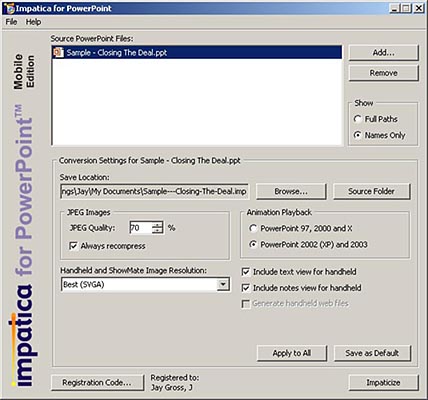 The registration requirement means you definitely have to do your conversions before leaving your office. Besides, the Showmates software runs only on Windows. There is no Macintosh version.