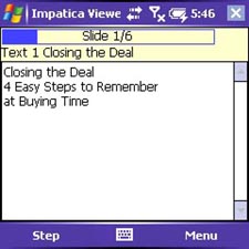 Refreshingly, the Treos screen blanking doesnt affect the slide being displayed. This means you can wax poetic answering a question or elaborating on a point without worrying about the blanking or turning it off. Tap the Treos big red button, then tap the screen with your fingertip or stylus, and the slide menu reappears as you left it. You probably wont even need the stylus to select slides. I could make it work with a fingertip, though maybe not acceptably for high-stress situations.