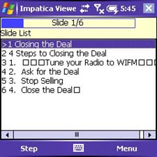 The Showmate includes software (see the accompanying screenshot) that runs on your computer to make special files that you move to the Treo. I simply copied them to an SD card. A companion piece of software that installs in the Treo downloads the presentation, in its entirety, to the Showmate. It displays a list of the slide titles, along with a "Next" and "Previous" button. A pull-up menu gives other options.