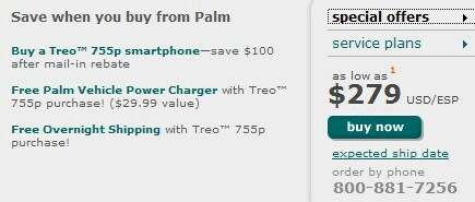 Palm is offering the Treo 755p for the same price as Sprint - You can get the 755p for as low as $279 (after a $100 with a mail-in rebate and a 2 yr contract). You also get Free Overnight shipping and a Free Palm Vehicle Power Charger ($29.99 value) when you purchase a Treo 755p through Palm's website.