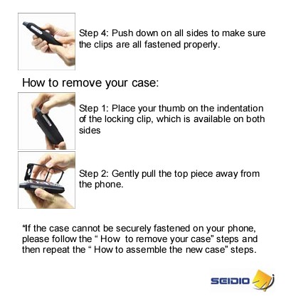 The RU uses a system of molded-in plastic.. well it's hard to even call them clips since they're more protrusions and recesses around the inside of the top and bottom halves that snap into each other. I simply could not get the two halves to snap together all the way around. Get one side snapped shut, work on the other side, snap snap, the first side unsnapped. I sat here futzing with it for an hour, I kid you not. Okay, enough. Either I just got stupid or this thing just plain didn't fit. So a call to a Product Manager at Seidio.