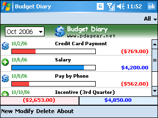 Budget Diary for WM Treos by PDAGear.net has been updated to 1.0. With Budget Diary, you can organize your Monthly Budgets right there in your Pocket PC, keep track of the Expenses & Income every month, view the Progress Bar representation of each income/expense representing its contribution towards the total, and Filter Records with Expense Filter / Income Filter.