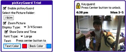 picKeyGuard by Toysoft Development is a new program for your Treo. Well, it was released last month in May, but it's new to me. When I first read the title, I was reading it as "pickey guard". Duh! But then my peabrain got it. ;-) This little app is a great idea and will let you spruce up the screen instead of seeing the same ole keyguard popup displayed.
