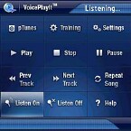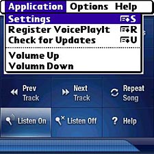 With music coming out of your headphones, press the Treos Apps button (Home by any other name), and tap the VoicePlayIt icon. If you dont turn off voice announcements, it welcomes you, even over the music. Tap the Listen On button (bottom row). When you start the program, the Listen On button is highlighted, but the program is NOT listening for your commands. You have to tap the button, even though its lit up. This could use some rethinking.