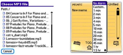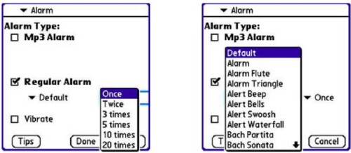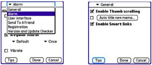The programs menu structure contains many more features and options than the Treos native Memos app. The most welcome of these is Alarm. This simply means you can set up a reminder for any memo in TreoMemos clutches. The alarm can repeat in an admirably extensive array of options. It can even play an MP3 music
