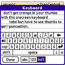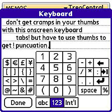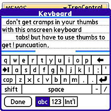 Maybe you can thumb your way through a long memo to yourself or someone else, but my thumbs get tired. Fast. Im delighted to report that TreoMemo offers an alternative. Tap the keyboard icon at the bottom of the screen, and the memos display shrinks to admit a graphic screen-bound keyboard that you can tap, instead of the mechanical keyboard.