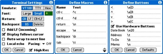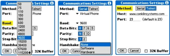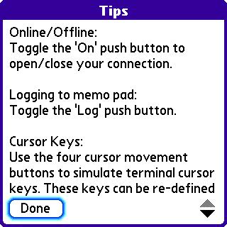 Unlike so many other Telnet clients, CSOnline's programmers even gave this beautiful little program a toggle-able "chat line" so one can enter text and then send it a line at a time, instead of out-going text mixing with incoming text in its main window. This is a feature I used to rant and rave about back in the days when I reviewed more Amiga terminal programs than I can even remember, and a feature lacking in most every other PalmOS Telnet client I tested.