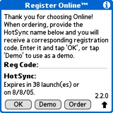 Reading 80 column text on a Treo's two inch screen can be a pretty painful experience, but Conklin has implemented the ability to change the font of the display via the "Large Font" checkbox in the "Display" dialog reached via the "Options" menu. This switches between a 7pt and 8pt fixed-width Minico font. The 7pt font allows Online to display 80 characters across the screen, greatly reducing the amount of scrolling required. There are no other font style choices, but believe it or not, as small as a 7pt font is on a Treo screen, it IS quite readable when the program is popped into hi-res mode with one of its preference toggles.