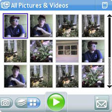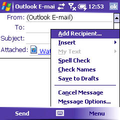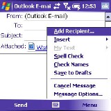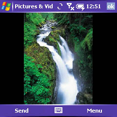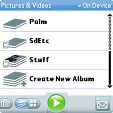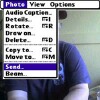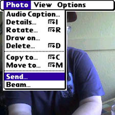 - On the Camera program, tap the Menu button in the bottom right border of the screen and then tap Send. (As with PalmOS, you can get here without taking a new picture. Open the Pictures & Videos program instead of Camera.)