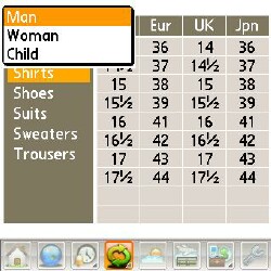 Conversions: Clothing. The size nomenclature we apply in the United States is nowhere near global, so this app is a great help for shopping in foreign lands. A pulldown menu lets you change the display from Mens to Womens to Childrens sizes. Shirt (and other) sizes stop short of big and tall, however, and Ive always been one of those.
