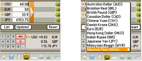 Conversions: Currency. Ahhh, this is the one that most impresses me. Choose up to four currencies in the top box, and then any entry in one of them calculates the equivalent other currencies. The whole thing depends on an internet connection you did opt for the unlimited data plan? and updates quickly when you want. To enter amounts, you can type directly into the little boxes or tap the blue and pink buttons below. Too bad the pink buttons dont include simple arithmetic functions, though you can total a series of amounts by tapping the big orange-backed arrow. This action adds the amounts to a running total in the boxes on the right. The little green icons on the right side transfer the total in the corresponding currency to the Expenses app, discussed shortly. The Reset button clears all. You can even enter your own currency and exchange rate for those occasional excursions to foreign planets .