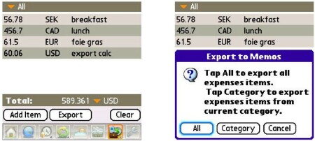 Expenses. Were all the way over to the next-from-last icon on the right, and this topmost sub-icon brings up one of the programs most useful features. It lets you organize and total up your travel expenditures in a boatload of currencies and export them to your computer in a format thats palatable to your favorite spreadsheet. Dont forget to use the categories selector. You can edit the category names and make more of them if you need say if your company insists on a breakdown by food, lodging, entertainment, etc., or by day.