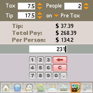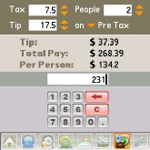 Tip calculator and check splitter. Calculating the tip for a bad server is easy. For good service, well, how many Euros, Yen, or Pesos you leave is a reasonable percentage of the amount of the check divided by the number of diners times the phase of the moon - a complicated matter, in other words. SplashTravel Pro offers a specialized calculator for just such occasions. You enter the tax (VAT or whatever), the percentage youd like to tip, and the number of diners. Tap the amount of the check on the blue and pink buttons, and the total, tip and per-person amounts appear. You can have the tip tallied before or after the tax is applied.