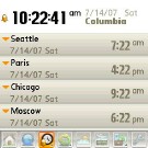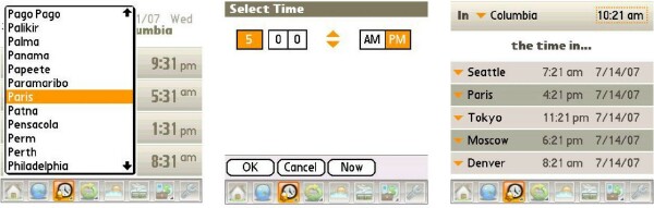 World Clock. This displays a world map in the top half of the screen. Tap and hold while moving the stylus, and cities flows by. Fast. If by chance you see your destination, let go and the app tells you the countrys capital. Big deal. You can also tell whether its night or day there, or turn that display off with the earth icon. A scrolling pulldown menu lets you choose a city in a more reliable manner. I found it rather difficult to get Paris (France) to appear, as the tiny map squeezes everything so close. I dont see much use for this app, since its day/night information is displayed on the Home screen but maybe you dont know your capitals.
