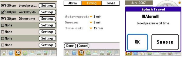 Clocks: Alarms. SplashTravel Pro offers up to nine possibilities for alarms, each with a variety of configuration options. These are quite useful whether youre sightseeing in Sweden or chillin out at home. They dont depend on web connectivity, either.