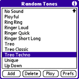RandomTones is a new Treo app from Toysoft. With RandomTones you can set to randomly select ring tones for Known, Unknown, Roaming and SMS when you get a new call or a new SMS. Optionally you can set a specified time to randomly change the ring tones.