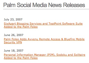 File this under notable. Palm has a separate section on their website for what they are referring to as social media press releases. The top four releases are Foleo-related.