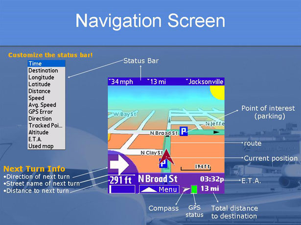 Here are some shots of the main interface of EMTAC Navigator V4, once you're routed and on the way somewhere.. this annotated picture nicely points out and describes all the stuff you'll see on-screen, saving me a few hundred words trying to explain it :) ..