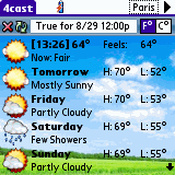 4cast downloads weather information from weather.yahoo.com. It displays forecast information for the next 5 days, and details (e.g. wind, humidity, text forecast ...) for today. 4cast also displays weather maps and alerts.