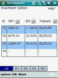 Investment Options is a powerful but easy to use application that will help you compare up to 4 investment alternatives at once. The application lets the user to easily populate the cash flows of an investment alternative and compare it using three common techniques: