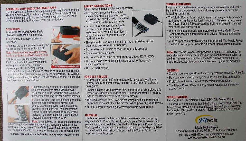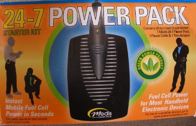 But now comes along yet another way to get portable power when you're in need of it. A company called Medis Technologies Ltd. makes yet another new emergency / totally portable charging solution their "24-7 Power Pack Fuel Cell", the subject of this review.