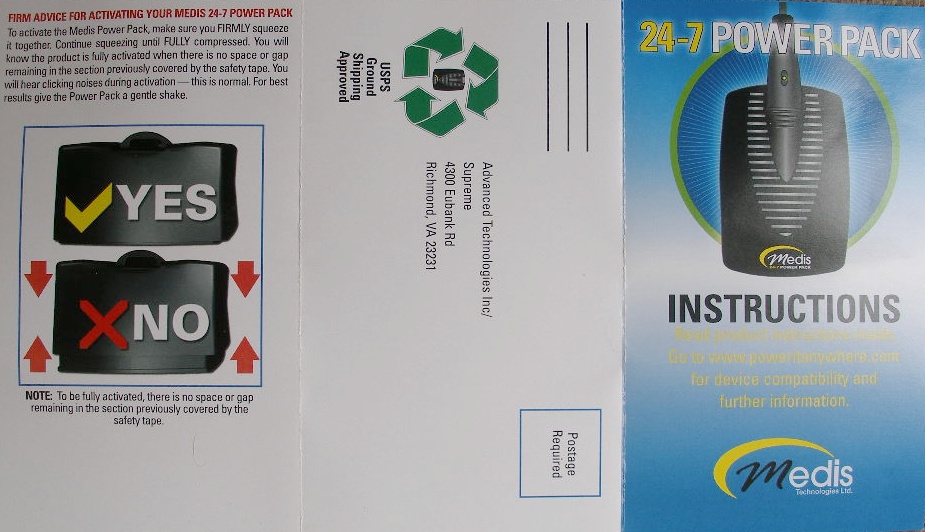 The $29.95 Medis 24-7 Power Pack, or just "Medis" for short, is a new product, made in Israel, but supported by a US-based head office. When "activated", this gizmo generates anywhere from 20 to 60 claimed hours of juice to power and charge all kinds of portable electronics, depending on what power tip you connect to it.