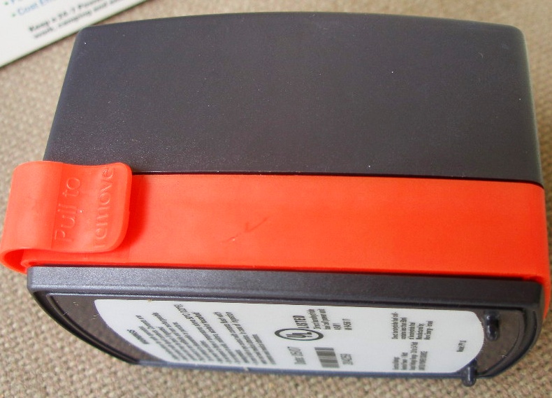 - The charger itself, which weighs 6 oz. and is about the size of a bar of soap, or three decks of playing cards stacked atop each other (one shown for scale). The charger comes un-activated, sealed in a plastic bag, and has a half inch wide, orange band around it, whose purpose I'll explain shortly
