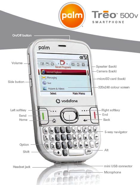 The big news from Palm this week was the announcement about the Treo 500v. In brief, it combines multiple forms of communication and multimedia capabilities with high-speed 3G/UMTS mobile internet access, allowing users access to popular websites such as MySpace, YouTube and eBay whilst on the move. The new Palm Treo 500v smartphone will initially be available exclusively to Vodafone customers from October. It runs Windows Mobile 6 Standard operating system. No WiFi and, get this No touchscreen!