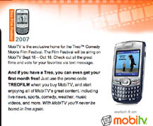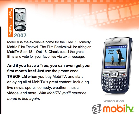 On Thursday, Palm and MobiTV, Inc., the leading provider and platform for content delivery over mobile and broadband networks, put out a press release to invite filmmakers to submit their made-for- mobile films to compete in the first Treo(TM) Mobile Comedy Film Festival which runs from Sept. 18th through Oct. 18th exclusively on the MobiTV(R) service.