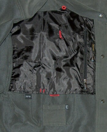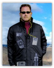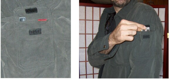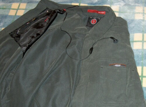 The chest pocket also has a small hole in which to put a wire. I really like the PAN system in Scott's clothing. If there's one thing that I can't stand, it's wires dangling or getting all tangled up. The PAN system keeps your wires out of the way, concealed, and at the ready for whenever you need to make a call or answer the phone. Anyone who owns an iPod knows how easily those earbud wires get tangled up. I kid you not; I can lay the earbuds down on my desk and not touch them. Then the next time I pick them up, they're tangled in a stupid knot! It's unbelievable! I have a nice pair of Koss headphones and they tangle up the very same way. Anyway, the chest pocket is nice and roomy and any of my Palm handhelds (in case) fit in the pocket with ease. Of course I wouldn't be able to snap the pocket shut with a larger device in there. Well, actually, the pocket won't snap shut with my Treo inside it, but that's okay, because there are larger pockets inside the shirt that also have the PAN system if I want to put my phone in them. But as you can see in the photo, I do have my Treo 680 in the chest pocket, and it's hooked up to the very nice PAN system. You can see the Treo sticking out of the top of the pocket and you can see the end of the earbuds, but the rest of the wire is hidden.
