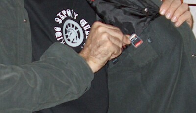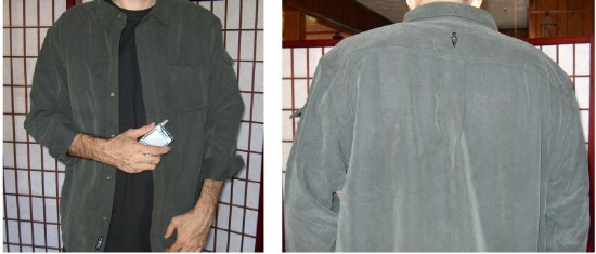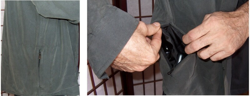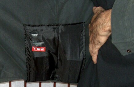 The TEC Shirt has a slash pocket on the lower right front. This pocket is actually two pockets because there's a small dividing seam between the two, at the bottom. There is a zipper that keeps the two pockets separate and also keeps items in the pockets from bumping together and from falling out. This special pocket is called a ZIP-PIP, (Zipper-Pocket-in-Pocket). The pocket is also referred to as a "Secret Pocket". I can put my hand in the pocket and slip my hand forward and that's one pocket. Then if I slip my hand back, there's the other pocket. So for example, I put my iPod with video in the forward pocket and have an SD card holder in the other pocket. You can't tell that either of the items is in the pockets just by looking at the shirt. What's so cool is that the two items don't even touch each other because of the small dividing seam and zipper. Ingenious! The photo on the right shows the inside view of the ZIP-PIP pocket. That's my husband Barry modeling the shirt for me in some of the pics. Thanks Barry! He's camera shy but I was able to talk him into "headless" shots.teehee!