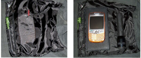 There are more pockets on the inside of the TEC Shirt! On the inside left and right edges of the shirt are two pockets for a Pen or extra Stylus. On the inside right of the shirt is a large pocket that is divided into two pockets. The pocket on the left is larger and can hold items like documents, handheld devices, or a digital camera. The pocket on the right is more narrow and comes in handy for a small flashlight or something like the original Apple nano. In this photo, I have my checkbook and Treo 680 in the larger pocket and a small Scorpion flashlight in the smaller pocket. There are many more types of items that you could put in the pockets and this is just one example. This pocket also has a zipper. The pocket has a small hole for your headphone wires too.