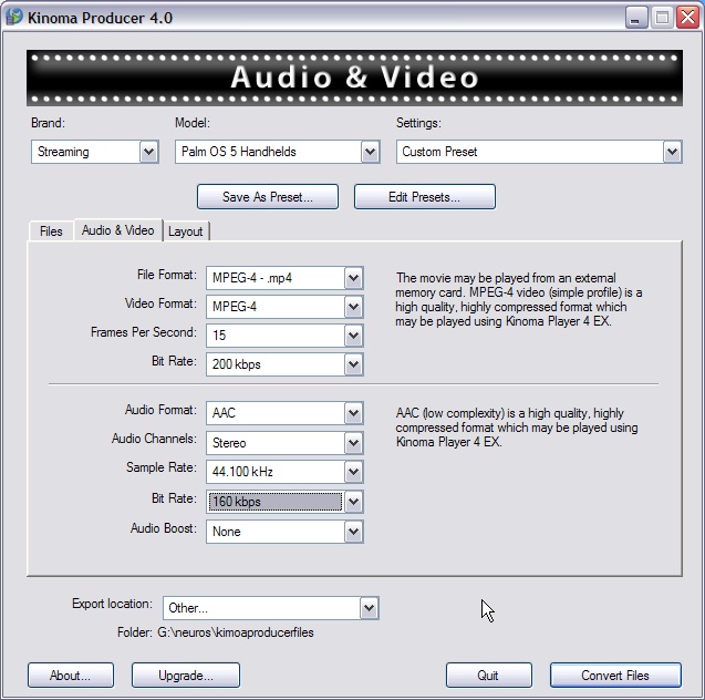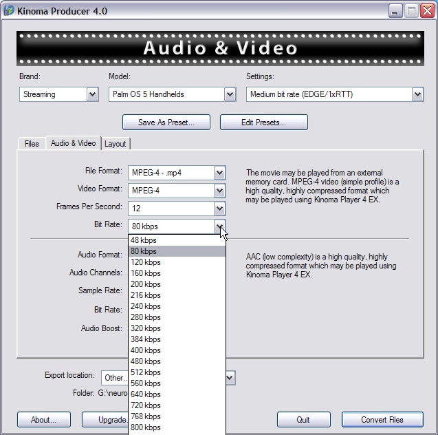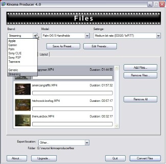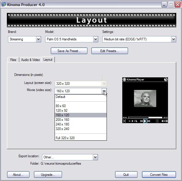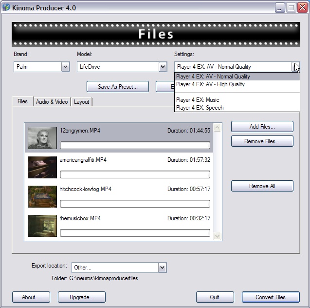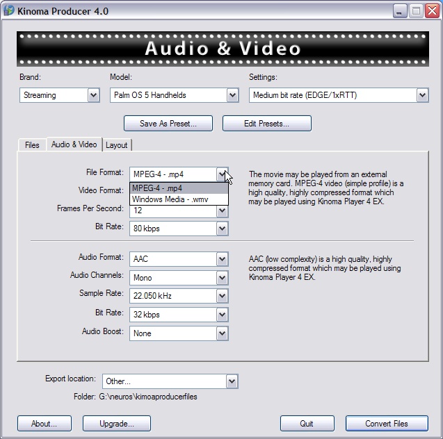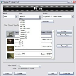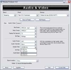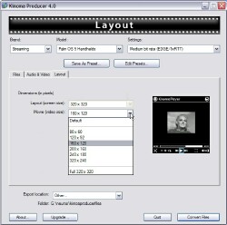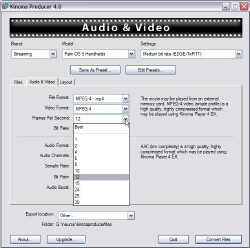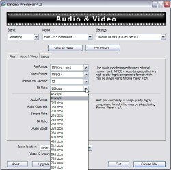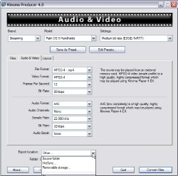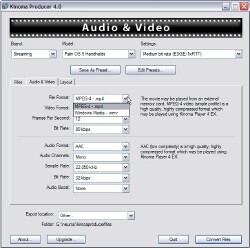 Got some old WMV-2 files you downloaded years ago? Kinoma Player can't play those. "Unknown file format" it'll tell you. Load those files into Producer, use its pre-set pull-downs, or, if you want to twiddle, its tabbed windows with settings for every possible audio and video parameter you could possibly want, and it'll read the file(s) off your hard drive, and write them back out in a more modern format that Kinoma Player knows how to play. ANY format it knows how to play.