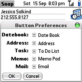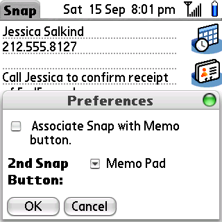 The Memo button association is a bigger problem, since theres no other button to map the application to in the Prefs utility that retains Snaps 2nd Snap Button option. This allows a second press of the Memo button to activate another app. Since Treos lack Tasks and Memos buttons, it would have been great to be able to active two different apps with a first and second press of a user-defined button, and the third app on the same button used with the Option key.